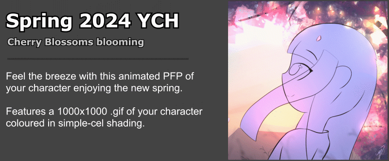 Feel the breeze with this animated PFP of your character enjoying the new spring.Features a 1000x1000 .gif of your character coloured in simple-cel shading.
